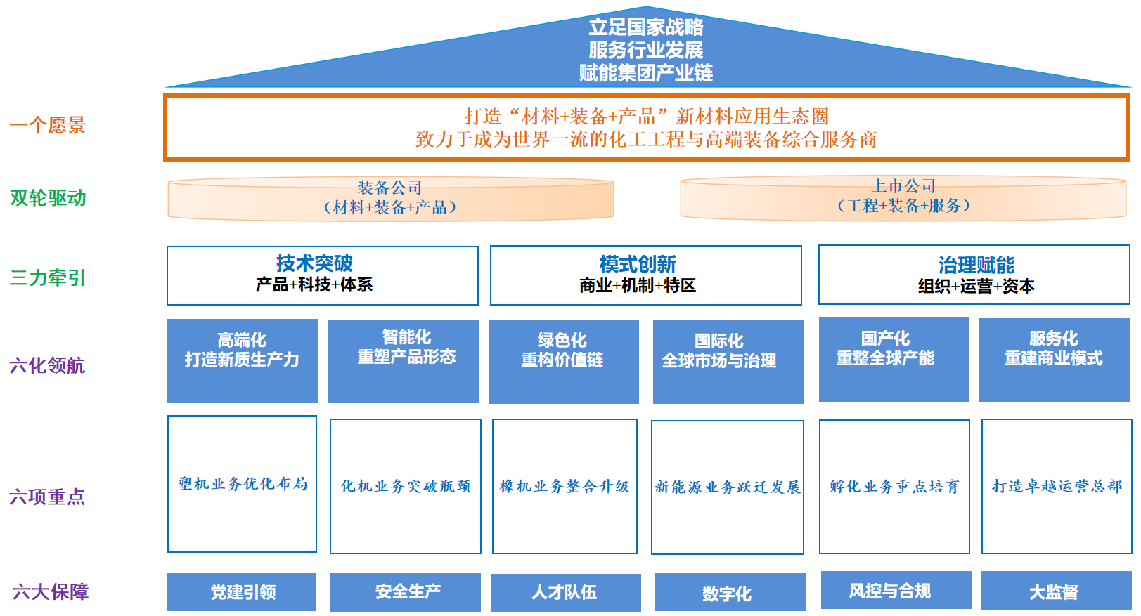 立足国家战略、服务行业发展、赋能集团产业链,积极打造“材料+装备+产品”新材料应用生态圈,致力于成为世界一流的化工工程与高端装备综合服务商,以此为蓝图引领未来五年改革发展。